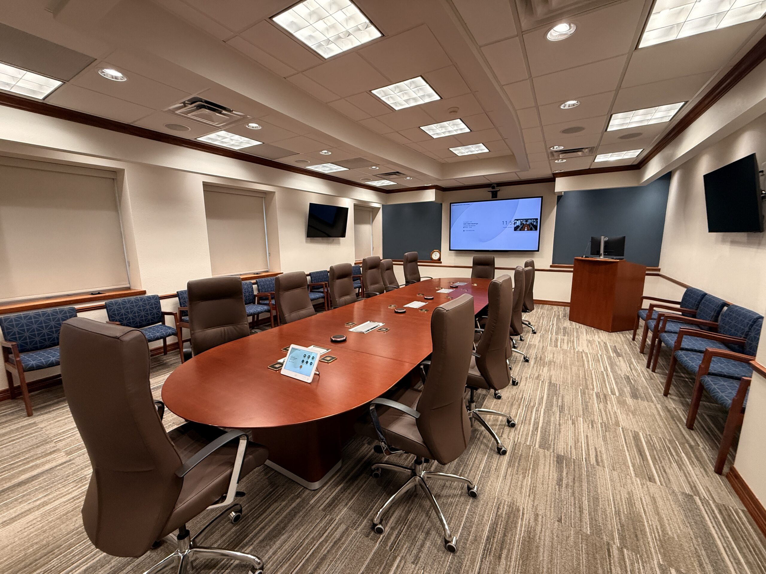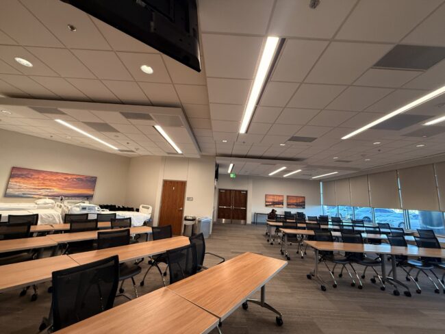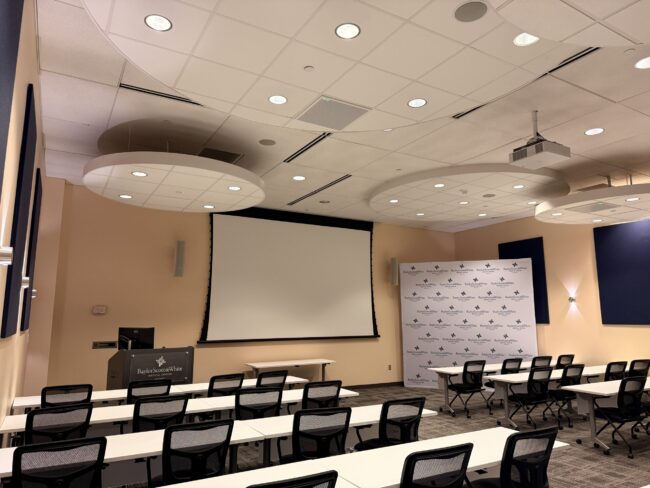 Training Auditorium Built for Big Groups, Clear Audio, and Reliable Meetings This auditorium is made for teaching and updates at scale. Up front you’ve got a proper presentation setup with a large screen, a dedicated presenter area, and plenty of seating that still feels organized—not cramped. The tables and rolling chairs make it easy to…