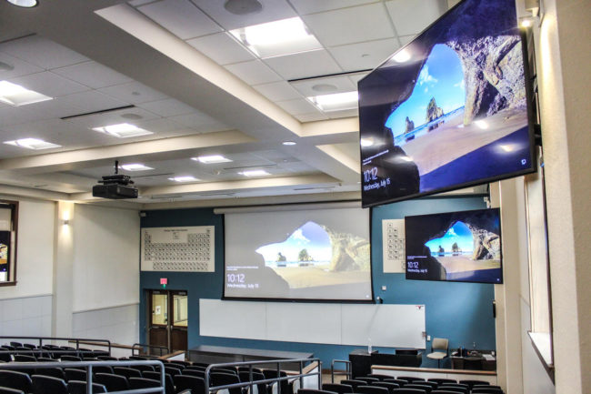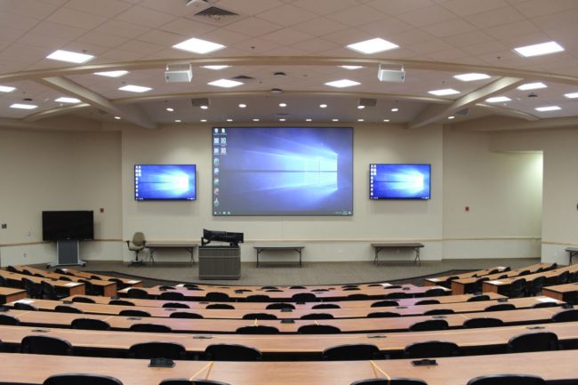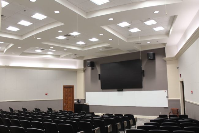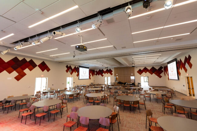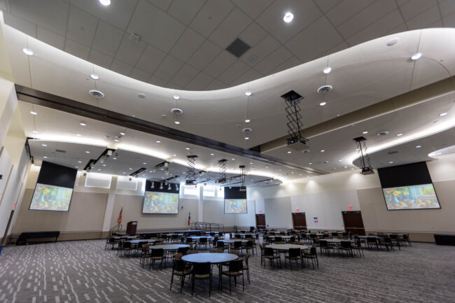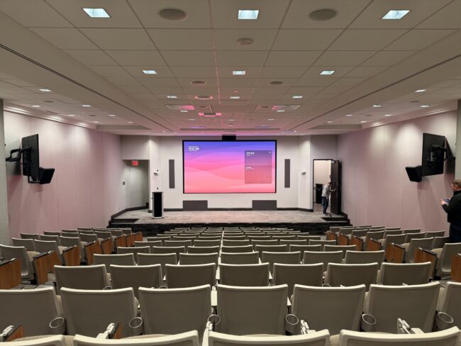 State-of-the-Art Auditorium for Engaging Presentations and Seamless Connectivity This auditorium features a large, high-definition display screen paired with a sleek podium and advanced audio-visual components like strategically placed speakers and cameras. The tiered seating ensures clear sightlines for all attendees, making it ideal for presentations, lectures, and events. Integrated video conferencing tools, including high-quality…