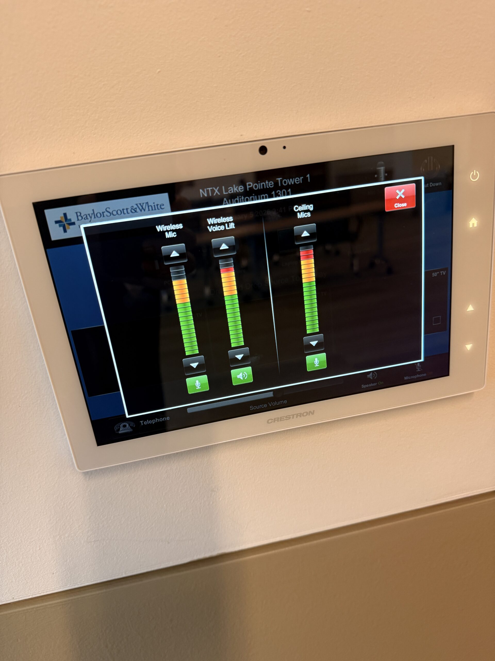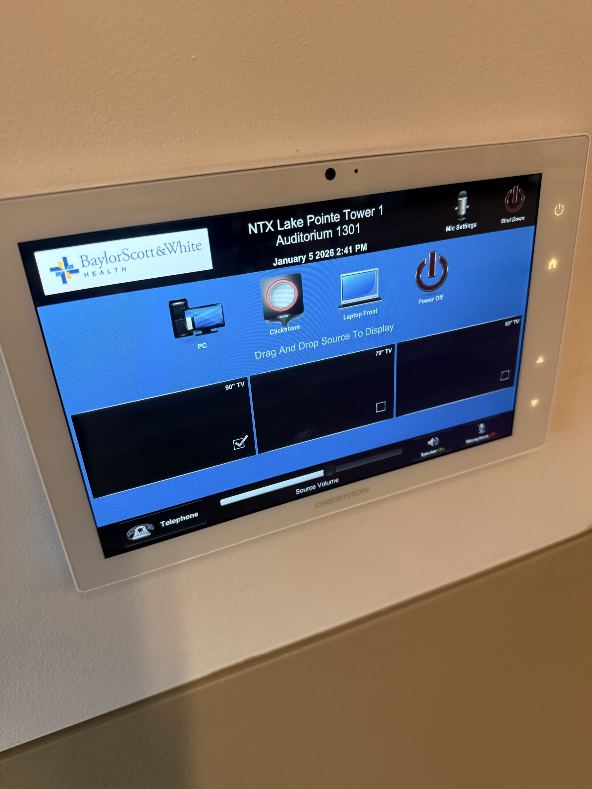 On the AV side, it’s clearly meant to be simple to run. There’s a dedicated wall control panel so staff can manage what’s on the screens, switch between presenter sources, and keep audio levels under control without calling in help. You’ve also got microphone support and room audio that’s set up to carry a speaker’s voice evenly across the space—so the back row isn’t guessing, and remote attendees aren’t stuck with muffled sound.